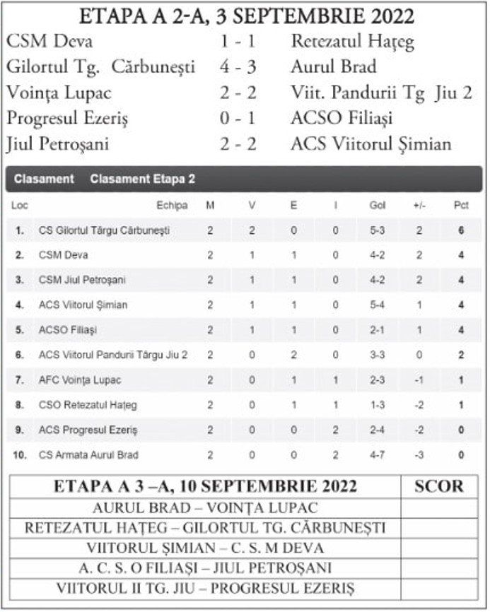 Patru echipe nu au pierdut în deplasare în etapa a 2-a, ACSO Filiași reușind chiar o victorie la Ezeriș. Retezatul Hațeg, surpriză mare la Deva, un egal smuls în minutul 90. Deși au deschis scorul și apoi au condus cu 2-1 la Tg. Cărbunești, cei de la Aurul Brad au pierdut cu 3-4.