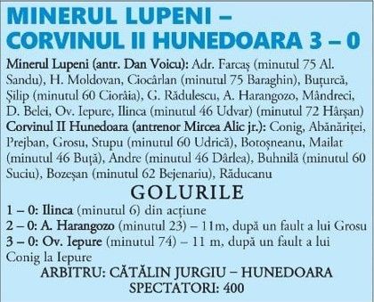 Minerul Lupeni - Corvinul II Hunedoara 3-0