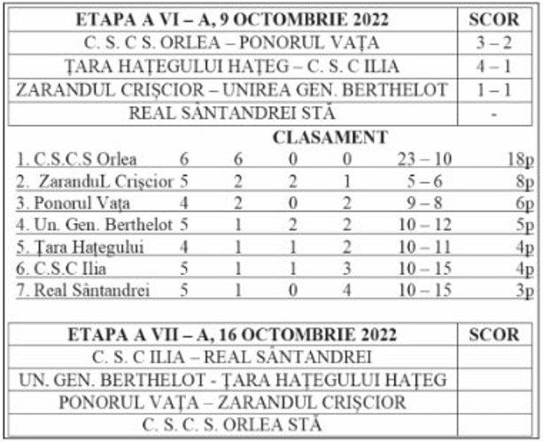 Liderul C.S.C Sântămărie Orlea a dispus cu 3–2 (2–0) de Ponorul Vața, după ce a condus cu 3–0 prin golurile reușite de Iancu Sterp (2) și Tomoni, respectiv Toc și Vraciu. În min.81, o altercație între Flavius Dragoș (Orlea) și Denis Nistor (Ponorul Vața) a dus la
