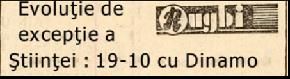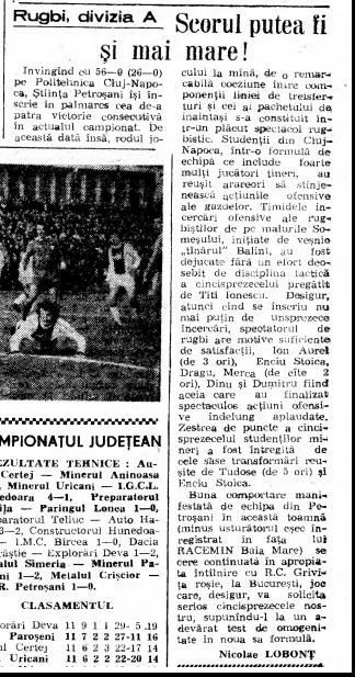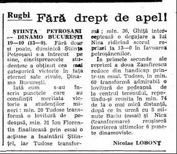 Știința-Dinamo 19-10 (13-0). „Știința Petroșani fără a putea alinia cea mai bună garnitură... a reușit o victorie reconfortantă, demonstrând celor peste o mie de spectatori că printr-o dăruire exemplară poate îngenunchea orice echipă. Rar ne-a fost dat să asistăm la o dominare atât de categorică a băieților noștri și asta tocmai în fața lui Paraschiv, Dărăban, Nica, Ion Constantin și a celorlalți internaționali dinamoviști. Prima repriză a fost controlată cu autoritate de gazde, ele detașându-se în învingătoare, chiar dacă deschiderea scorului se produce doar în minutul 20, în urma loviturii de pedeapsă transformată de Tudose, după ce trei situații clare de eseu fuseseră incredibil ratate. Superioritatea evidentă a studenților este concretizată prin „essai-urile” semnate de Ion Florentin și Ghiță, primul transformat de Tudose. Cu 13-0 la pauză, rugbyștii petroșeneni abordează relaxat repriza secundă și de o neatenție a lui Enciu Stoica profită Zafiescu, autorul primelor puncte dinamoviste.... avea să vină și eseul doi al dinamoviștilor, apoi... Tudose care a știut să-și onoreze aniversarea de 23 de ani printr-o comportare bună, parafeză victoria echipei sale transformând magistral două lovituri de pedeapsă (prima dintre ele de la cca. 50 de metri de buturi).”