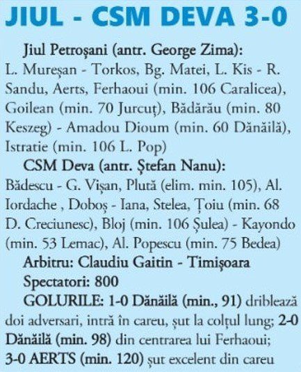 Urmează imediat și eliminarea antrenorului Devei, Ștefan Nanu, pentru proteste repetate la adresa arbitrajului, vine și golul de 3-0, Jiul încheind en fanfare o partidă dificilă, dar cu o victorie pe deplin meritată, chiar dacă în minutul 118, Lemac a pus și el ”la număr” a patra minge trimisă în bară.