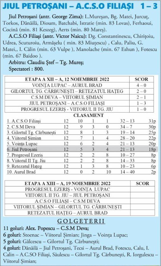 Fără vreo rezonanță istorică ori vreo performanță de răsunet (poate acea victorie în Cupa României cu U.T.A. anul trecut), echipa gorjeană A.C.S.O Filiași se instalează pe primul loc al Seriei a 7–a a Ligii a III – a. Cu largul concurs al Jiului! În ce sens? Că echipa alb-negrilor și-a creat o sumedenie de ocazii, dintre care nu au fructificat decât una. De altfel, înaintea meciului antrenorul gorjenilor, Victor Naicu, avea numai cuvinte de laudă la adresa Jiului, spunând că este una dintre cele mai bune echipe ale