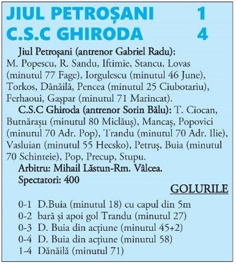 C.S.C Ghiroda a dat patru, a mai avut două bare - minutul 21 și 26 Buia, și 5 (cinci) ocazii clare (minutul 29 și 37 Al. Popovici, minutul 42 Petruș, intervenție M. Popescu, minutul 88 Mancaș, minutul 90+3 D. Pop, apără M. Popescu) -, jiuliștii mulțumindu-se (sâc!) cu golul de onoare și cu o mare ocazie (minutul 52 a lui June).