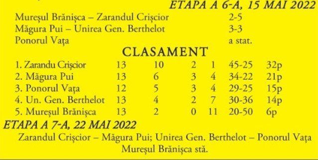Retezatul Hațeg își consolidează poziția de lider cu o victorie la Geoagiu, prin golurile marcate de Ov. Popesc (2) și Cosmin Pau. CSM Vulcan a câștigat derby-ul Văii Jiului, 4-2 (3-2) cu Inter Petrila, aceasta din urmă o mare dezamăgire în final four. Minerul Uricani (antr. Toni Sedecaru) nu reușește decât golul de onoare la Deva, rămânând în continuare pe ultimul loc.