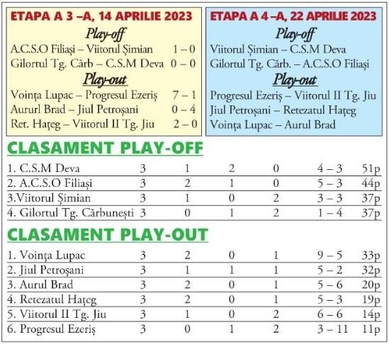 *Scoruri mari în play-out, aici lucrurile părând a se limpezi în ceea ce privește retrogradarea, cu echipele din Tg. Jiu și Ezeriș aflate pe făraș;