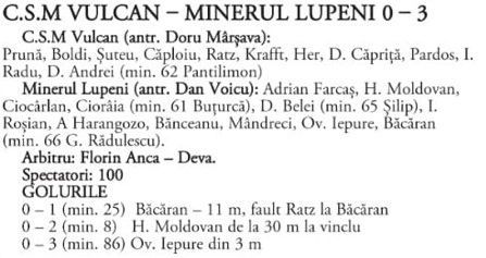 C.S.M. Vulcan - Minerul Lupeni 0 - 3 (0 - 1)