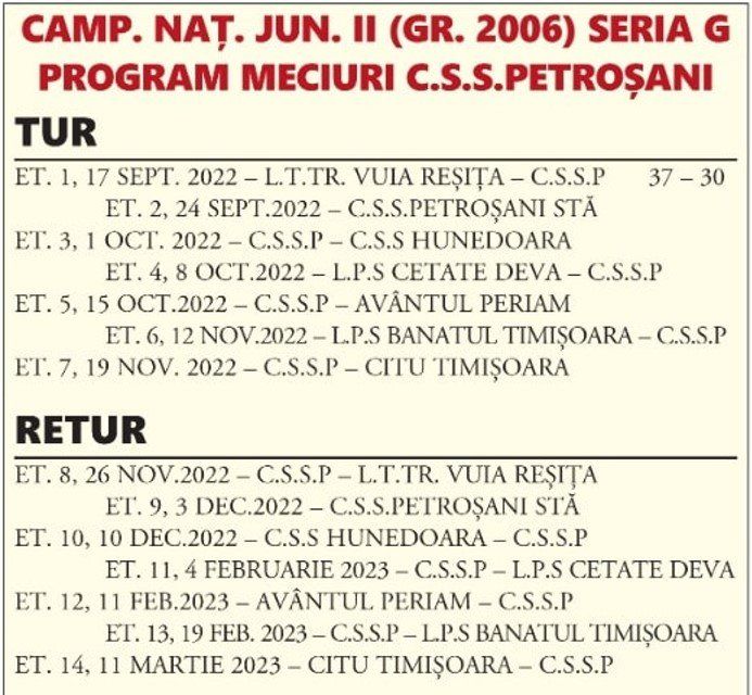 La acest nivel, junioarele III chiar cu un derby de Valea Jiului, încheiat la Vulcan cu victoria petroșenencelor la scorul de 34 – 18. La junioare II, C.S.S Petroșani a pierdut în deplasare, 30 – 37 la Reșița.