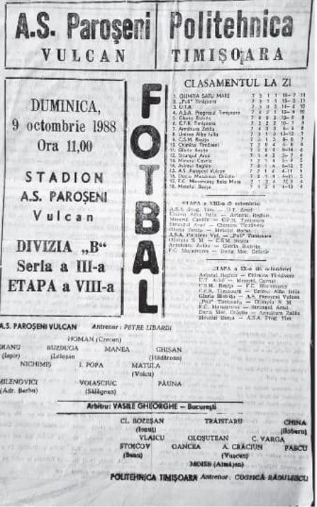 Astfel, echipa lui Petre Libardi (cu Homan, Buzduga, Dianu, Ghișan, Dan Voicu, Adr. Barbu, I. Popa etc.) pierde 1-2 „Poli” rămâne în coasta Olimpiei Satu Mare (3-1 cu C.S.M Reșița), iar populația Vulcanului trăiește clipe de fericire o perioadă de timp, prin cadoul făcut de timișoreni, într-un octombrie al foamei, acum 35 de ani.