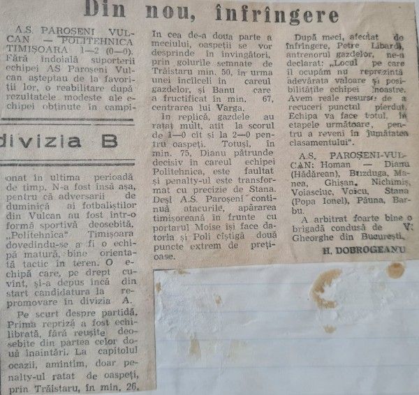 Facsimil cu cronica meciului A.S Paroșeni-„Poli” Timișoara (1-2)