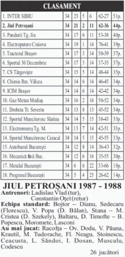Ultima etapă, pe 13 dec. 1987 (la -12 grade!) o victorie cu 1-0 cu Metalul Bucureşti instalează Jiul pe primul loc în tur. După înfrângerea, 0-2 la Electroputere Craiova, din etapa a 19-a, Jiul nu va mai prinde locul 1, mai ales după înfrângerea în meciul direct cu Inter Sibiu (etapa a 28-a), 0-1 sub Cibin, în faţa a 20.000 spectatori! O victorie în ultima etapă cu 5-1 la Metalul Bucureşti nu mai ajută la nimic. De reţinut că în tur echipa a fost condusă de antrenorul Tică Oţet, a avut câţiva jucători de excepţie: Bojtor (constant, sobru), Dianu (ambiţios, activ în ambele faze), D. Timofte (rezistent, tenace şi subtil), Lasconi (poftă de gol). Din păcate, la polul opus, au fost şi acte de indisciplină, motiv pentru care V. Popa, Szekely şi B. Popescu au fost excluşi din lot.