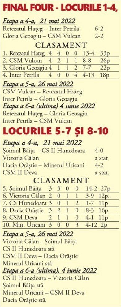 Cu siguranță, ultima etapă va fi o fiesta pe stadionul din Hațeg, echipa Retezatul urmând a participa la barajul pentru Liga a III-a, unde a jucat ultima oară în sezonul 2009-2010.