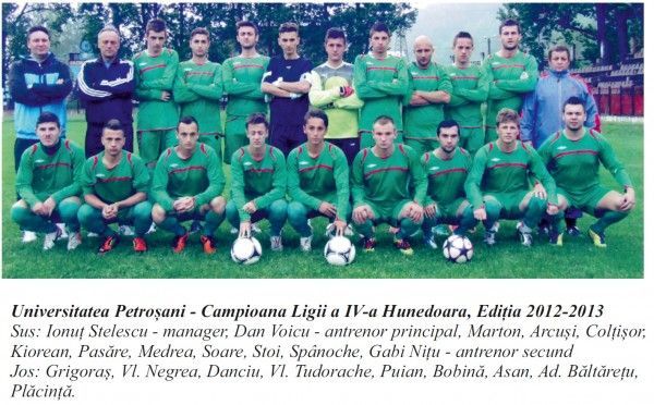 Echipă de tradiție în fotbalul zonal, Știința Petroșani a dispărut în anul 1980. A trebuit să treacă 19 ani, până în 1999, când Ionuț Stelescu a inițiat proiectul de a relansa echipa de fotbal, de data asta sub numele Universitatea Petroșani. Au urmat ani mai buni, mai răi, echipa rezistând până în 2020, când s-a dizolvat. A avut însă acel moment de vârf, în 2013 (iată, au trecut 10 ani de-atunci...), când a câștigat Liga a IV-a Hunedoara, participând la un meci de baraj, din păcate, pierdut cu 0 – 2 în fața celor de la Știința Turceni.