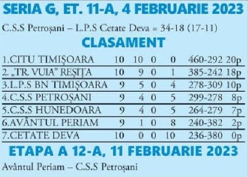 S-a reluat Campionatul Național de handbal fete junioare II (16 ani) cu jocurile etapei a 11-a (mai sunt trei etape), Seria G. A.H.S.C.S Citu Timișoara rămâne neînvinsă în acest sezon, în timp ce echipa lui Alexandru Rotaru, C.S.S Petroșani, reușește o victorie la scor, 34-18 (17-11) în dauna ultimei clasate, L.P.S Cetate Deva.