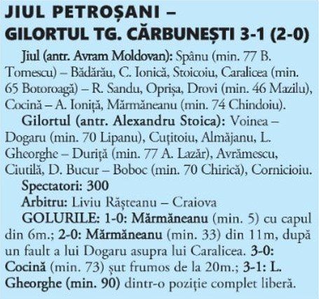 Jiul a început în forță, având în față o echipă fără niciun obiectiv, având emoții, chiar dacă gorjenii au avut ocazia egalării în min. 23, când portarul Spânu a apărat ”capul” lui Boboc. După pauză, Cocină (min. 48) și A. Ioniță (min. 56) ar fi putut mări avantajul, dar șuturile lor nu au nimerit ținta.