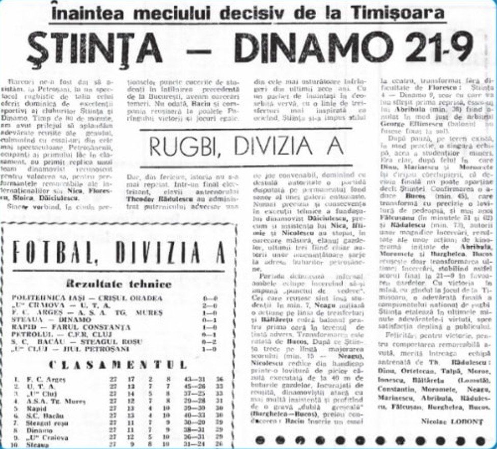 ”Știința și-ar fi droit titlul atunci dar timișorenii, pe teren propriu cu mii de suporteri. N-a fost o tragedie, băieții s-au bucurat tot drumul de la Timișoara la Petroșani – să tot fi durat atunci vreo 6 ore! – fericiți că sunt vicecampioni” spune Nicolae Lobonț. A mai urmat un joc la Petroșani, pe vechiul stadion ”Jiul”, 19-10 cu Grivița Roșie București.
